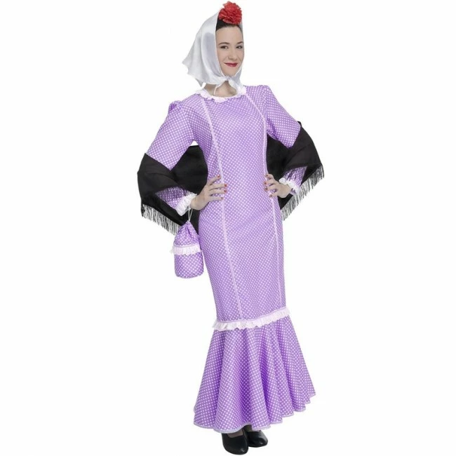 Te ofrecemos el nuevo traje chulapa lila para mujer. Una fiesta San Isidro en Carnaval, Halloween o una despedida de soltera puede ser una ocasión inmejorable para disfrutarlo. Asómate a la nueva imagen del disfraz madrileña chulapa de mujer. El disfraz femenino de Chulapa color lila talla adulto está compuesto por el vestido, el mantón, el pañuelo y el bolsito a juego. Además, está disponible en 3 tallas diferentes para poder disfrutarlo en la que más se adapte a ti.