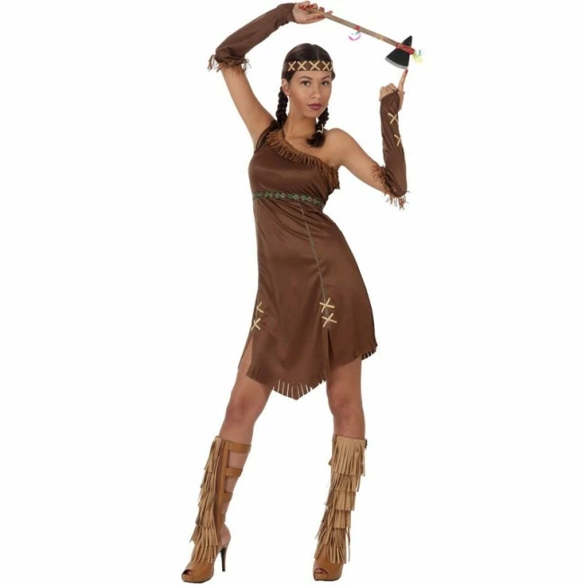 Disfraz de india compuesto por vestido, accesorios de los brazos y cinta cabeza. Si no sabes de que disfrazarte en la próxima fiesta de disfraces, no lo dudes y adquiere este bonito disfraz de india americana. Ideal para carnaval o fiestas con temática oeste.