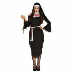 Incluso el clero ha debido verse afectado por la invasión zombie que acecha nuestra tienda online este mes previo a la fiesta de Halloween. Esta pobre monjita debió de verse sorprendida en su monasterio por algún zombie y se ha debido de infectar. El disfraz de monja sangrienta zombie se compone de vestido, cinturón y cofia. Añádele cápsulas sangre y algo de látex para darle un toque más terrorífico.