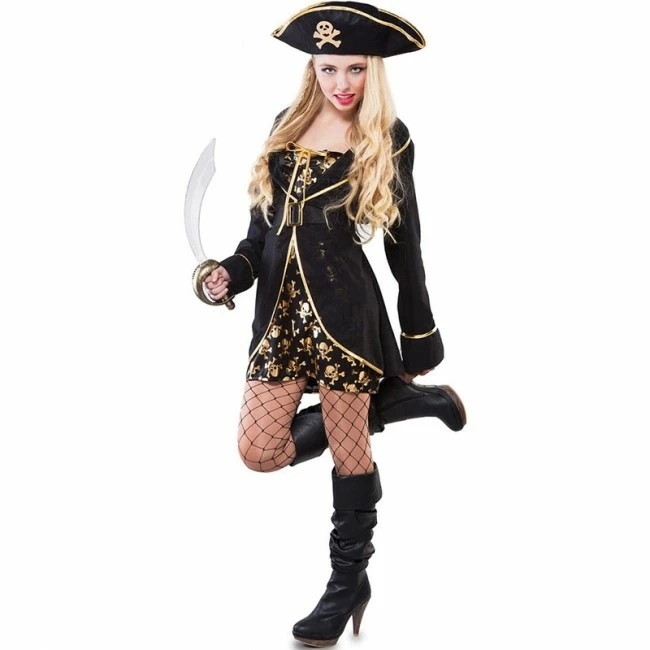 Surca los mares de cualquier océano con este modelo de pirata sexy. Transfórmate en una corsaria gracias a este disfraz con acabados en dorado. Un modelo pirata muy original que hará que no paséis desapercibidas en vuestra próxima fiesta de disfraces.