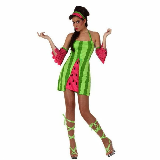 Disfraz de Sandía, fresquito y dulce! Perfecto para grandes grupos y comparsas en cualquier tipo de fiesta de disfraces con temática de frutas, a un precio asequible. Incluye: vestido, accesorio de los brazos y tocado.