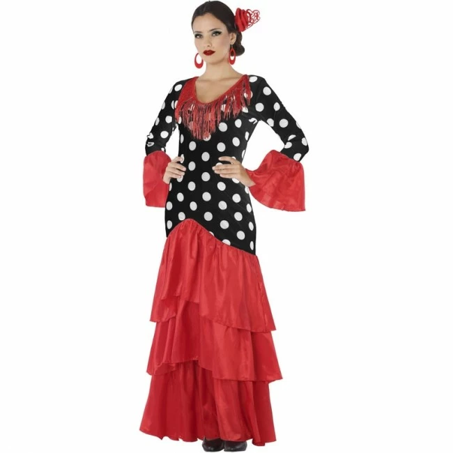 Este disfraz femenino de Andaluza talla adulto consta de un vestido que combina negro con lunares blancos en la parte de arriba junto al rojo de la falda y los volantes de las mangas. Además, te lo ofrecemos en tres tallas diferentes para que puedas escoger la más apropiada para ti. Compra el vestido Flamenca mujer Triana en nuestra tienda online y recibirás el pedido de forma urgente.