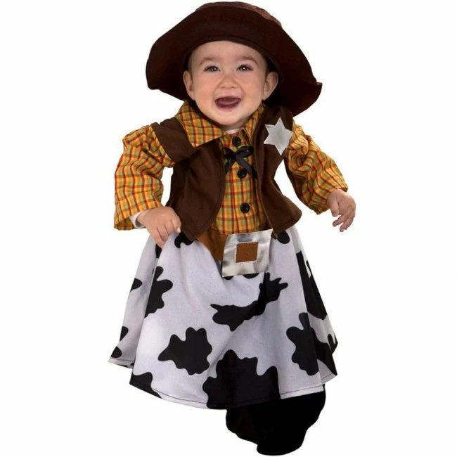 Original y económico disfraz de vaquera para hacer de la más peque de la casa toda una auténtica cowgirl del oeste. Disfraz compuesto por mono y gorro y disponible en talla 6 a 12 meses.
