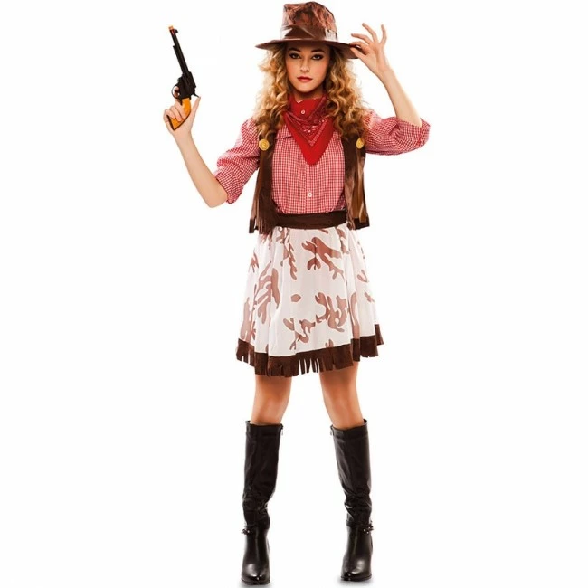 Completo disfraz de vaquera o cowboy compuesto por chaleco, falda, pañuelo y sombrero. Echa un vistazo a la versión de vaquero hombre. ¡ Pareja perfecta !. Perfecto para grandes grupos en carnaval y fiestas de disfraces con temática oeste.